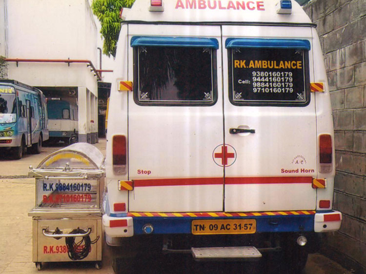 We are one of the Ambulance operators in Chennai. R.K.Ambulance established company 1999.In our main concern is for quality and customer satisfaction. We operate in five star locations in Chennai, Mylapore, Triplicane, T.nagar, Kilpauk, Puliyanthope, Anna nagar. We have different types of ambulance for Deadboady freezer box, Mortuary van, Ac/Non Ac ambulance, ICA ambulance, Funeral services provide mortuary A to Z total package total service as per the requirement of our more clients. Service our motto. Our services are also available for private hospitals and private function and government function, Seminars, Road shows and cinema shooting etc.